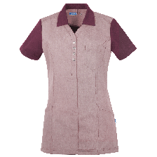V-hals met kraag; rug + mouwen van stretchstof (55% katoen / 45% polyester, 185 g/m², piqué); half blinde drukknoopsluiting; korte mouw; 1 borstzak; 2 zijzakken met sleutellus, rechts met telefoonzak; zijsplitten