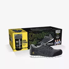 Deze promobox bevat onze gerecyclede MORRIS S1P veiligheidsschoen + een gratis paar "Wolfpack" saunaslippers + een gratis Safety Jogger drinkfles.